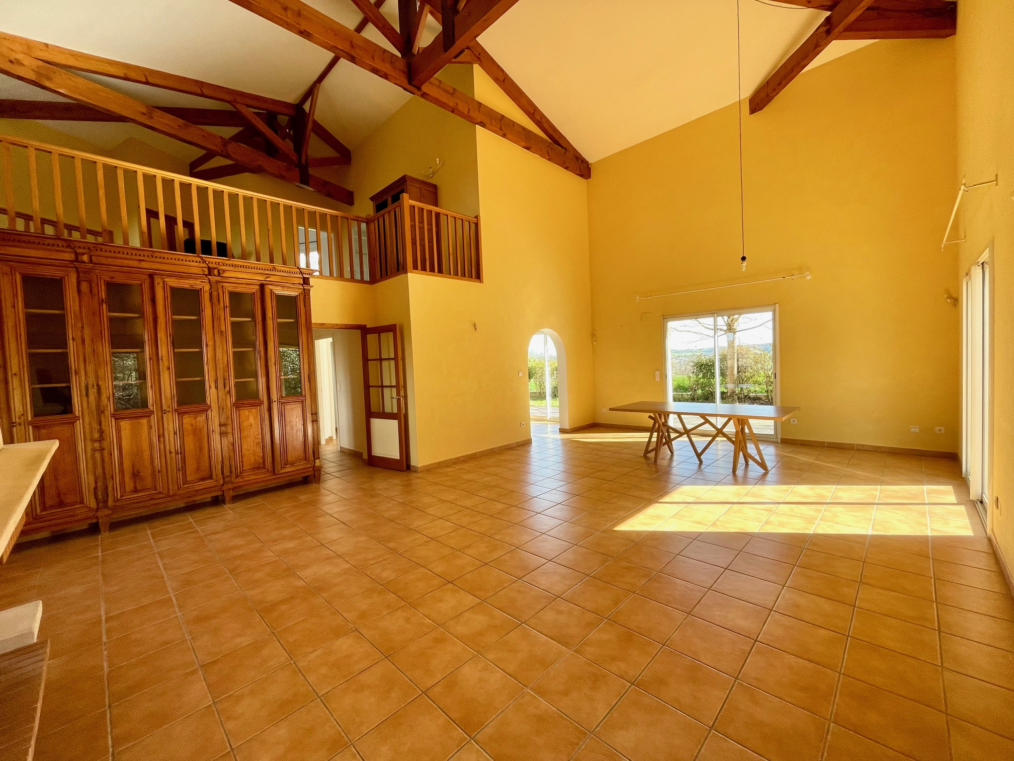 Maison T7 de 230 m2 sur terrain de 3700 m2 à Casteculier Nous avons le plaisir de vous présenter cette très belle maison d'architecte en R+1 de 230 m2 sur un terrain de 3700 m2 avec piscine. Vous serez séduits par sa situation avec vue à quelques km d'Agen, sa luminosité et ses prestations. Vous disposez de plain pied d'un grand séjour de 50 m2 avec plafond cathédrale et triple exposition donnant sur une cuisine équipée de 17 m2 et un cellier de 5,6 m2. Une grande entrée équipée de placard et penderie distribue la pièce de vie sur la gauche et la partie nuit sur la droite. Celle-ci est composée de quatre chambres avec penderie dont une avec dressing ( 10 m2, 10,4 m2, 12,3 m2 et 20,5 m2) ainsi que d'une salle de bain de 11,5 m2. A l'étage une salle de jeu de 24 m2 façon mezzanine permet d'accéder à une chambre de 10 m2, un bureau de 8 m2 et une salle d'eau de 6,5 m2 avec wc. Cet espace permettrai de faire une grande suite parentale. Enfin un escalier depuis l'entrée (11 m2) permet d'accéder au garage de 98,4 m2 avec sectionnelle. Nous trouvons ensuite une cave de 24 m2, les pièces dédiées à la chaudière, pompe à chaleur et cuve de fioul ainsi qu'une partie bonus de 20m2 servant de cuisine d'été car donnant côté piscine via une grande terrasse. Cette pièce dispose également d'une salle d'eau, wc et salon. Côté piscine ( 10X5 m avec débordement) vous profitez d'une belle vue dégagée sur la nature. Le portail électrique d'entrée donne l'accès à un chemin bitumé qui descend directement au sous sol de la maison. Le système de chauffage économique s'appuie sur une pompe à chaleur air /eau, un système d'eau chaude au fioul et une cheminée avec insert en complément, le tout permettant d'obtenir un DPE en C. Les menuiseries sont en double vitrage. Taxe foncière 3200€ Les honoraires sont à la charge du vendeur. Les informations sur les risques auxquels ce bien est exposé sont disponibles sur le site Géorisques
