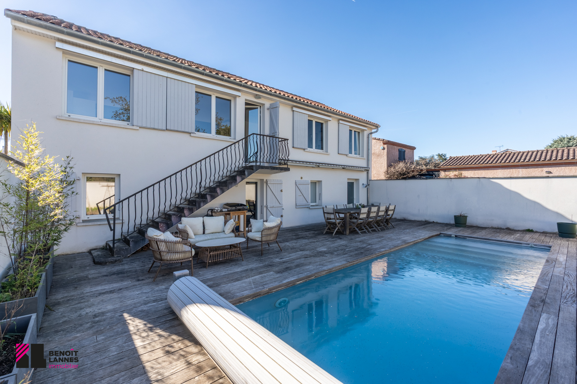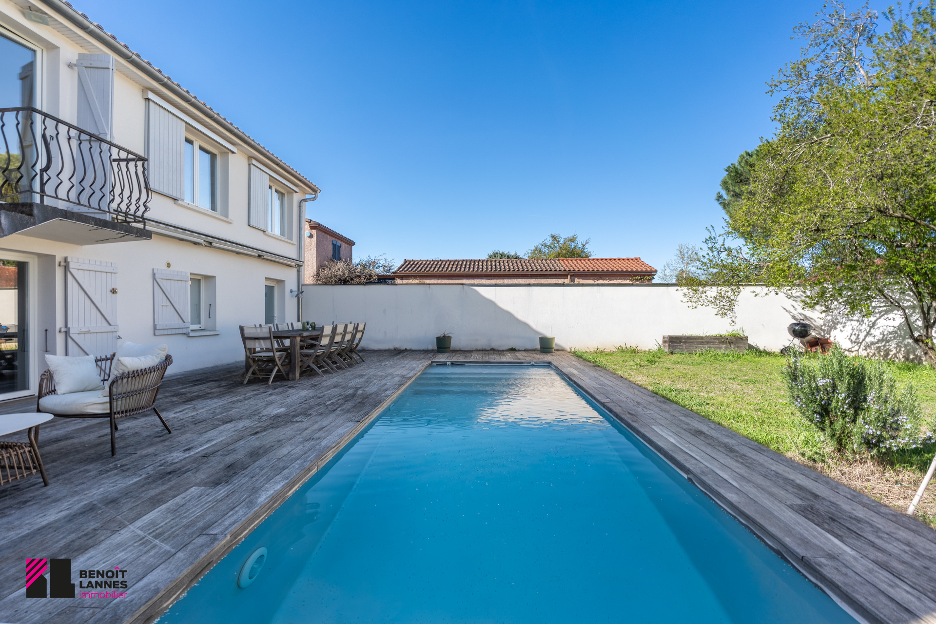Toulouse Lardenne - Maison rénovée de 145m2 avec piscine et garage Au coeur du secteur recherché de Lardenne, dans un environnement calme et résidentiel, venez découvrir cette agréable maison de 145m2 en R+1, entièrement rénovée avec goût en 2018, implantée sur une parcelle de 480m2 avec piscine sécurisée, terrasse et garage. Dès l'entrée, le charme opère: parquets anciens, volumes généreux, luminosité et prestations de qualité confèrent à cette maison une atmosphère chaleureuse et élégante. Une maison clé en main, idéale pour une famille, alliant confort, modernité et qualité de vie, dans un quartier très apprécié. La maison bénéficie d'un emplacement stratégique, à proximité des sites d'Airbus et du pôle aéronautique, de la clinique Pasteur et de l'aéroport de Toulouse-Blagnac, avec un accès rapide au périphérique. A l'étage: Une magnifique pièce de vie traversante de 50m2 baignée de lumière grâce à son exposition Est/Ouest. Cet espace accueille un salon/salle à manger spacieux, ouvert sur une cuisine contemporaine entièrement équipée et aménagée, idéale pour partager des moments conviviaux. Ce niveau comprend également deux chambres de 11m2, une salle d'eau avec douche à l'italienne et des toilettes indépendantes. Au niveau inférieur: Cet espace propose une belle suite parentale de 25m2 avec dressing et salle de bains (douche et baignoire), une grande chambre de 20m2, une buanderie aménagée et des toilettes indépendantes. Côté extérieur: L'extérieur pensé pour la détente offre une piscine sécurisée, un agréable jardin facile d'entretien, une vaste terrasse en bois protégée par un store banne. Un garage de 20m2 avec la possibilité de stationner un véhicule supplémentaire sur la parcelle. Confort et prestations: Climatisation réversible Menuiseries aluminium double vitrage Cuisine équipée et aménagée Piscine sécurisée avec volet automatique Garage Fibre optique Borne de recharge pour véhicule électrique Informations pratiques: DPE: D Commerces à proximité Ecoles maternelles et primaires à quelques minutes Accès rapide au périphérique Gare TER, plusieurs lignes de bus et Linéo Lardenne: Situé à quelques minutes du centre de Toulouse et du Capitole, le quartier de Lardenne a su préserver une véritable atmosphère de village, offrant un cadre privilégié entre ville et nature. Très apprécié pour son calme, son esprit familial et son environnement résidentiel Lardenne séduit particulièrement les acquéreurs en quête de tranquilité et d'espaces extérieurs, tout en restant à proximité immédiate des commodités. Le quartier bénéficie également d'un cadre de vie pratique avec de nombreux commerces, de services, d'écoles maternelles et primaires ainsi que de collèges et lycées à proximité immédiate, de structures sportives et culturelles qui participent à la qualité de vie du secteur.