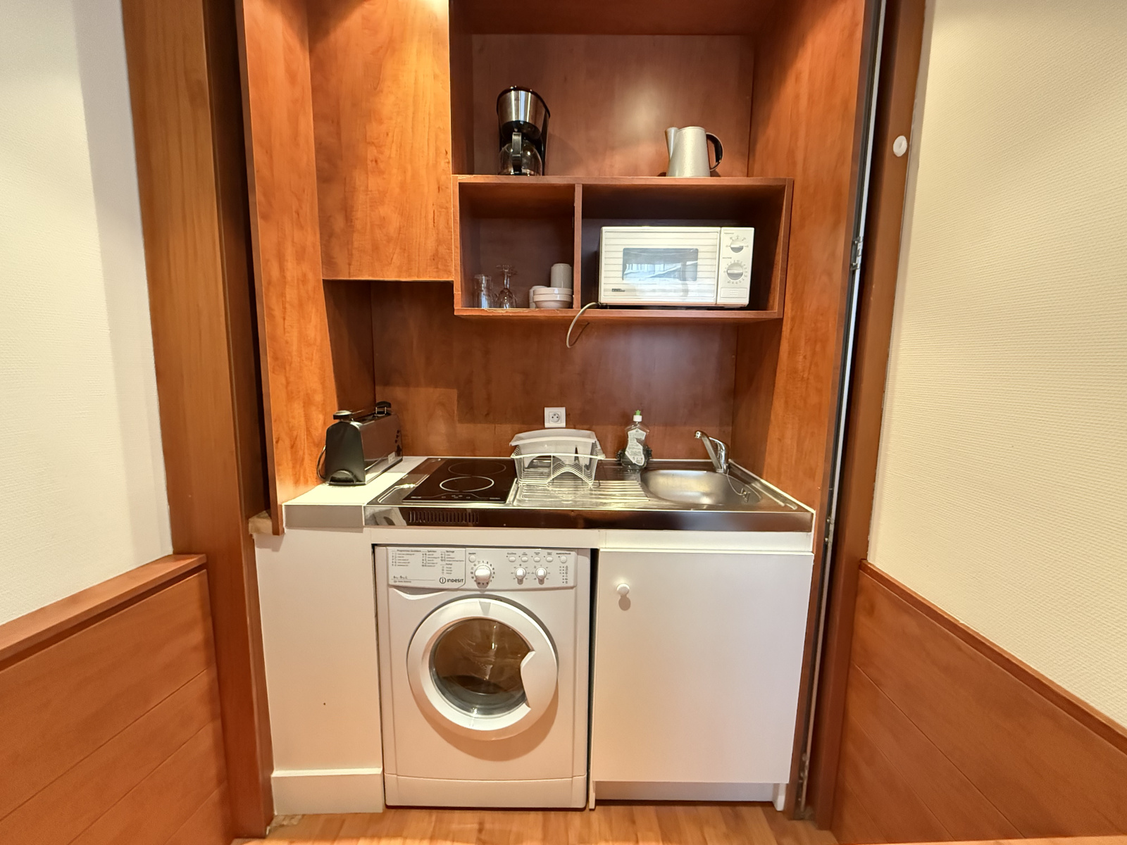 L'appartement se compose d’une grande pièce de vie avec un espace bureau et salon avec TV écran plat, un coin cuisine tout équipée, plaque, four micro-onde, frigo, lave-linge. Coté chambre un lit King size de 160 cm. La salle de bain se compose d’une baignoire, WC, sèche serviette et sèche-cheveux. De nombreux rangements sont à votre disposition. L'appartement est climatisé.