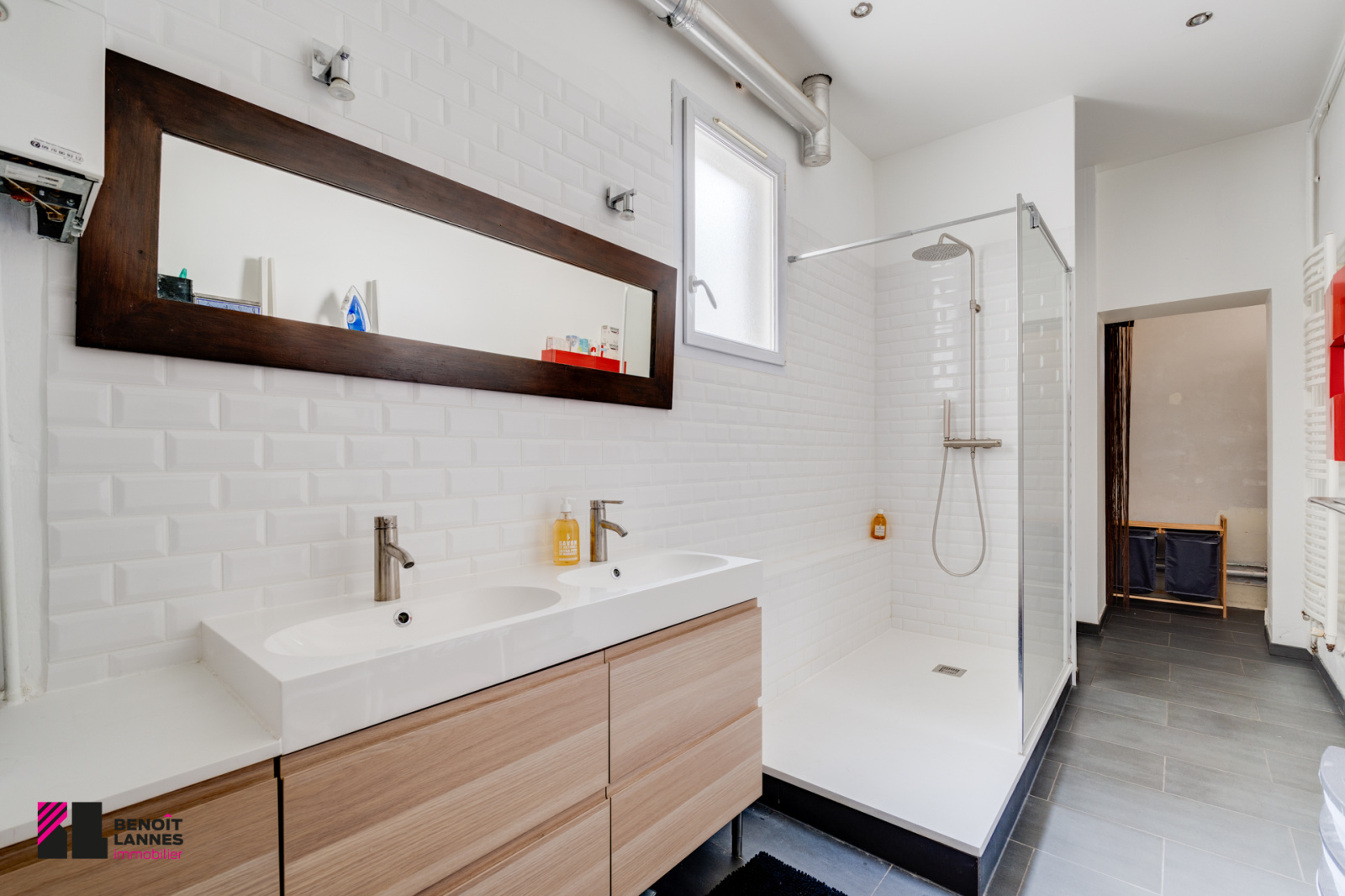 Une vaste salle d'eau de 9,50m2 avec double vasque et douche à l'italienne;