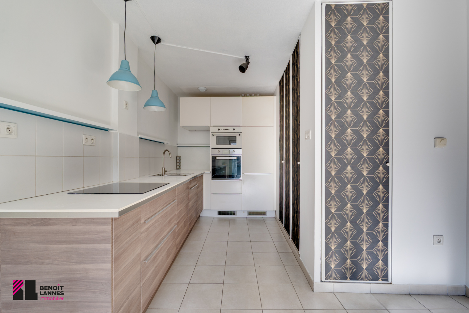 Une cuisine meublée et équipée avec plaque à induction, hotte aspirante, lave-vaisselle, four, frigo et micro-onde intégré.