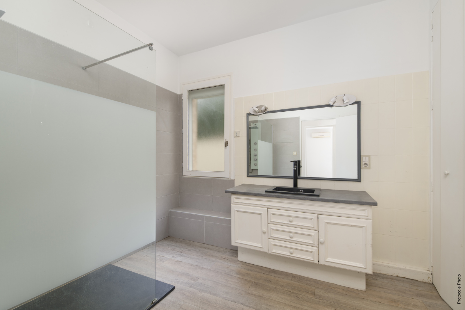 Une salle d’eau de 8 m² avec douche et meuble vasque.