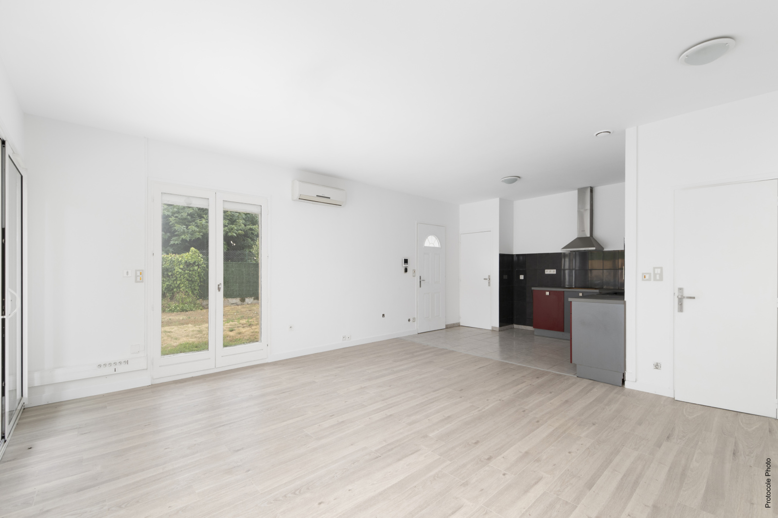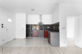 Une entrée donnant sur une pièce de vie de 38.5m² avec sa cuisine équipée