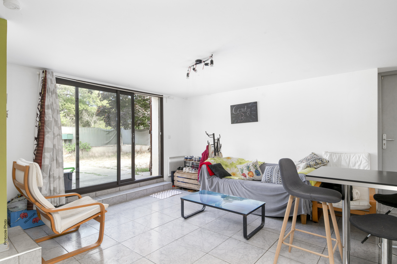 Une entrée donnant sur le séjour commun 32 m² et la cuisine.