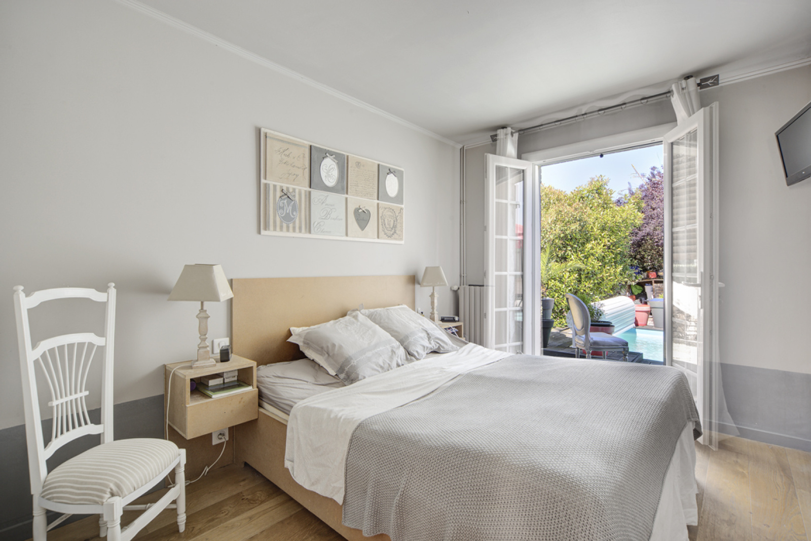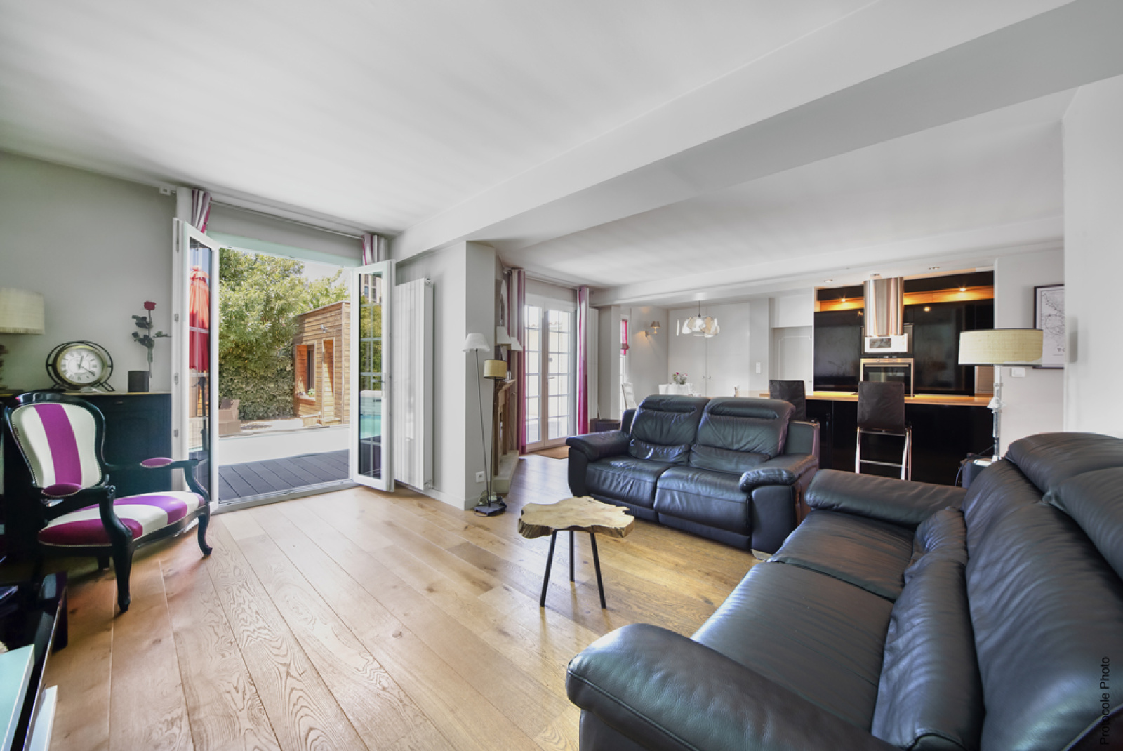 De grandes ouvertures donnent à la pièce une belle luminosité et une vue agréable sur la piscine.