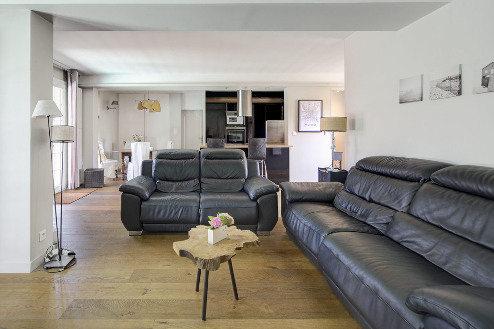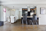 Une entrée dessert la pièce de vie avec une cuisine américaine entièrement aménagée et équipée.