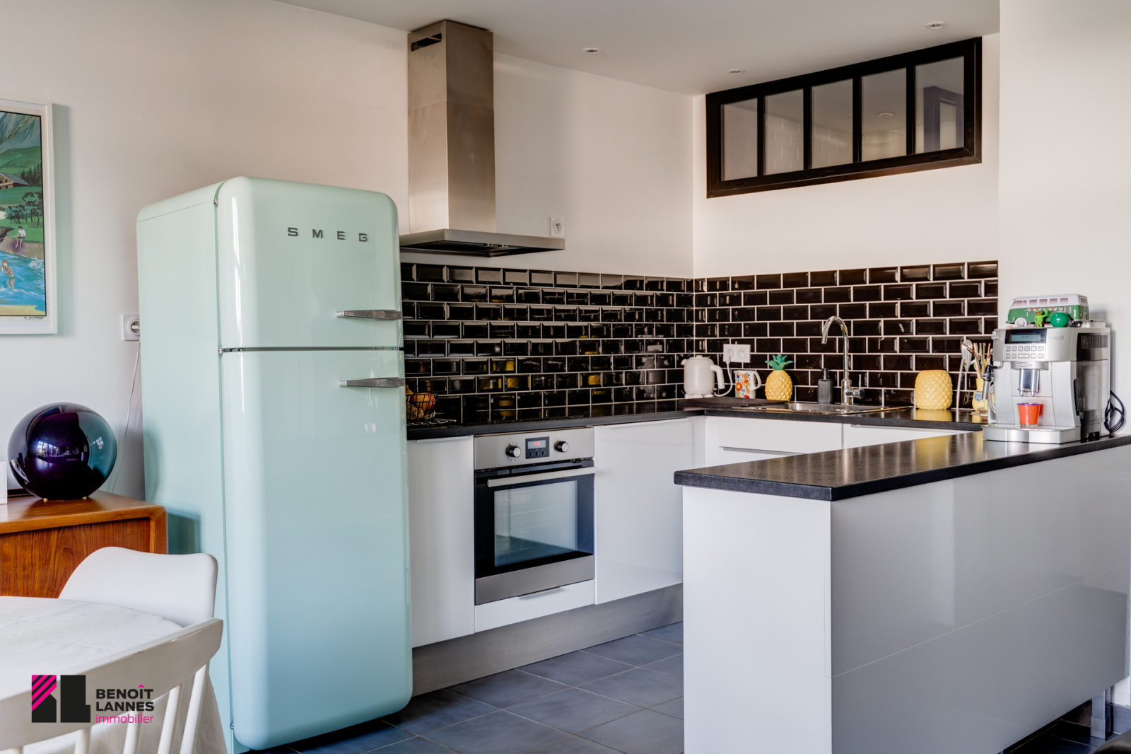 Une cuisine entièrement meublée et équipée avec plaque à induction, hotte aspirante, lave-vaisselle.