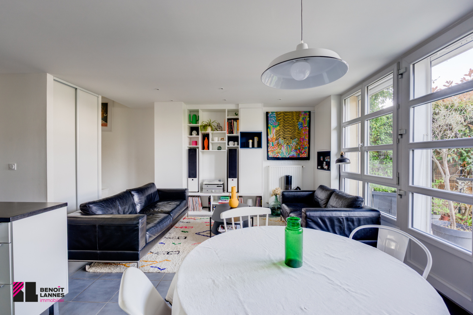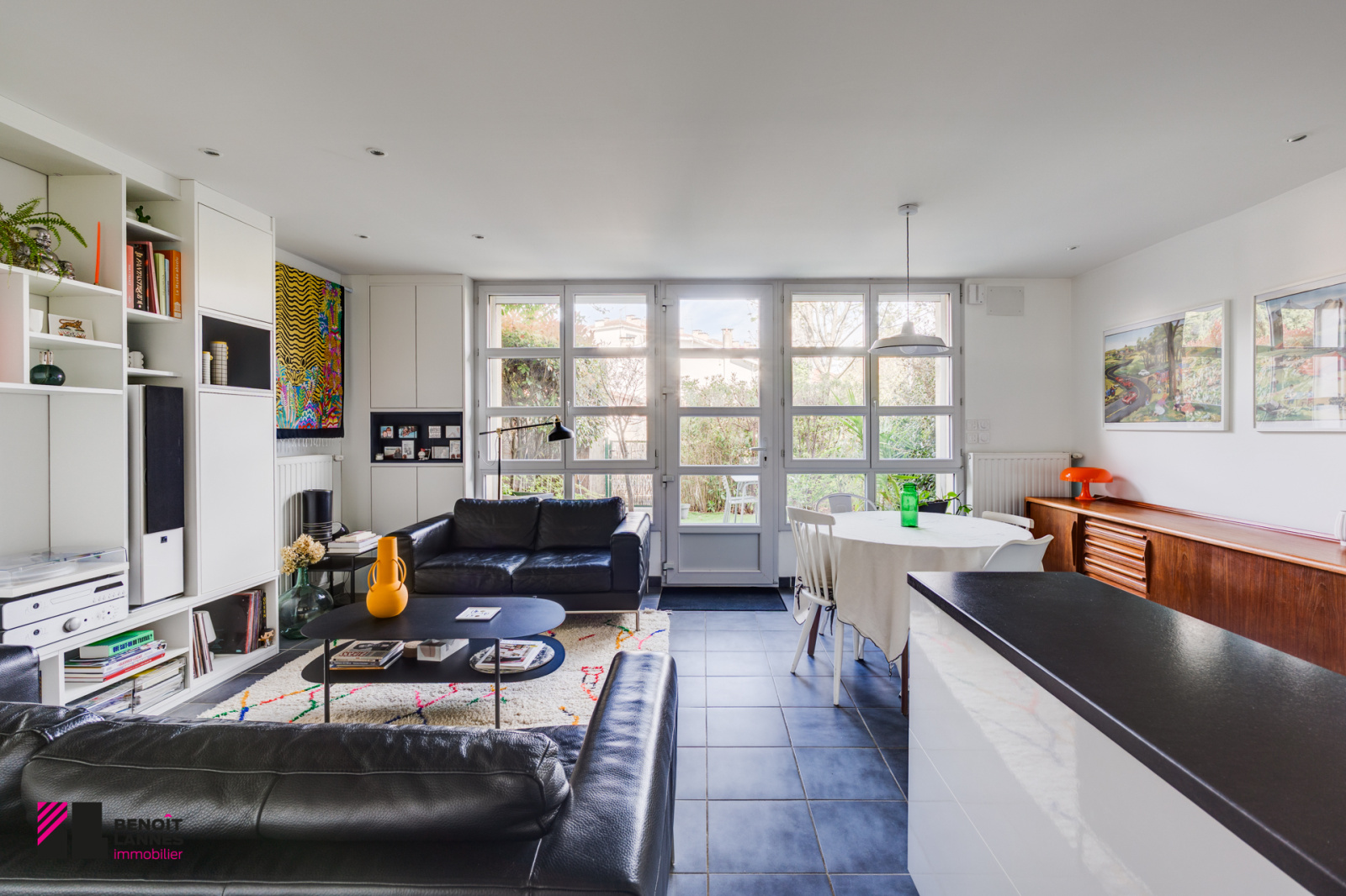 Un salon cuisine de 33 m² donnant sur une terrasse et son jardin. Le salon est équipé de meubles intègres sur mesure.