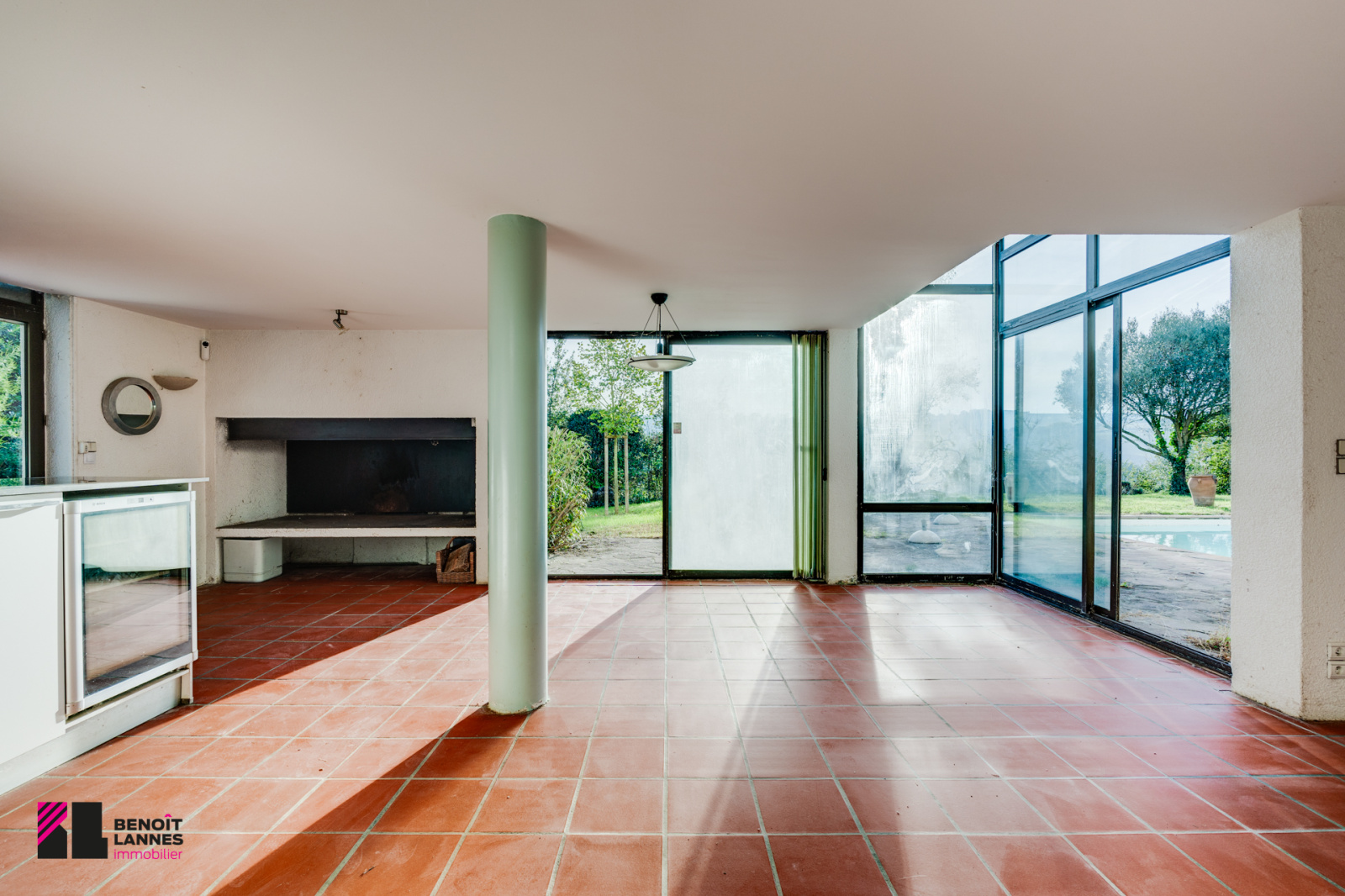 Conçue dans les années 80 par un architecte, elle nécessite des travaux ( sols, murs et salle de bains) pour la remettre au goût du jour . Sa conception est inversée avec son entrée se situant au 2 ème niveau et la pièce de vie au rez de jardin avec la piscine.
