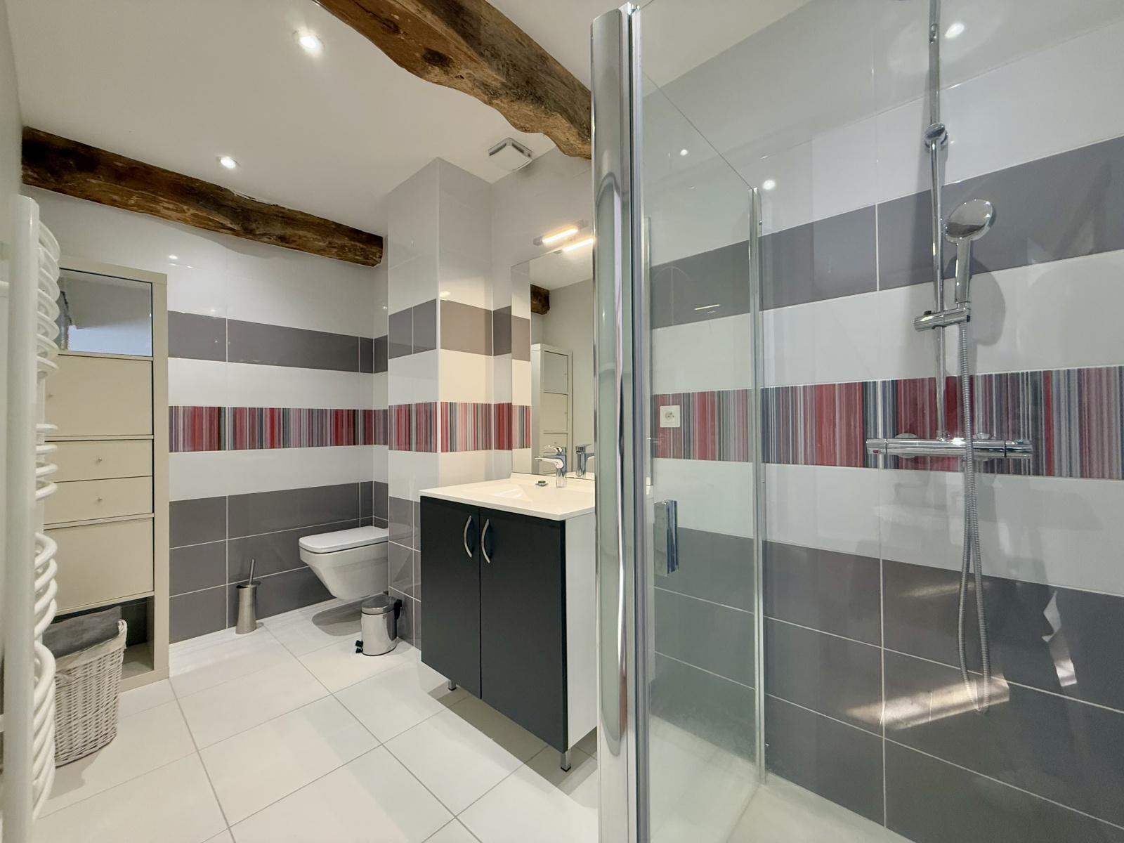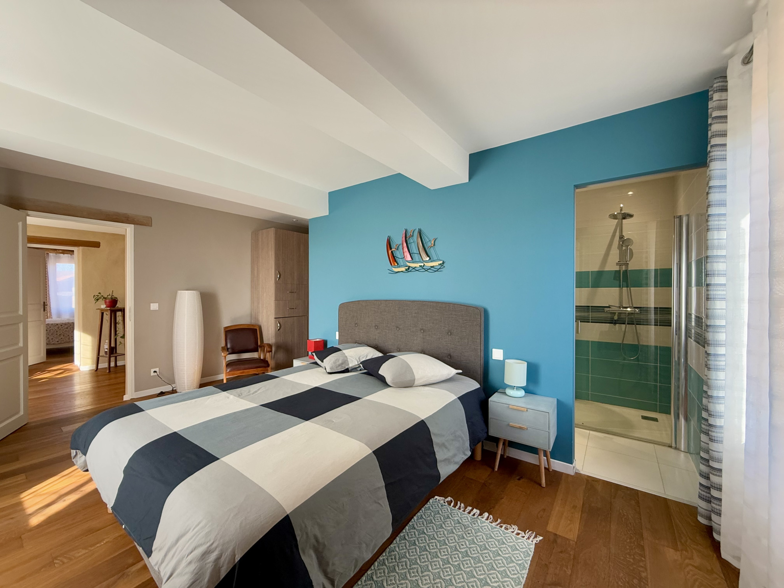 A l'étage, un palier dessert deux belles chambres avec parquet bois et poutres, disposant de leur propre salle d'eau avec douche à l'italienne et toilettes, garantissent à chacun confort et intimité.