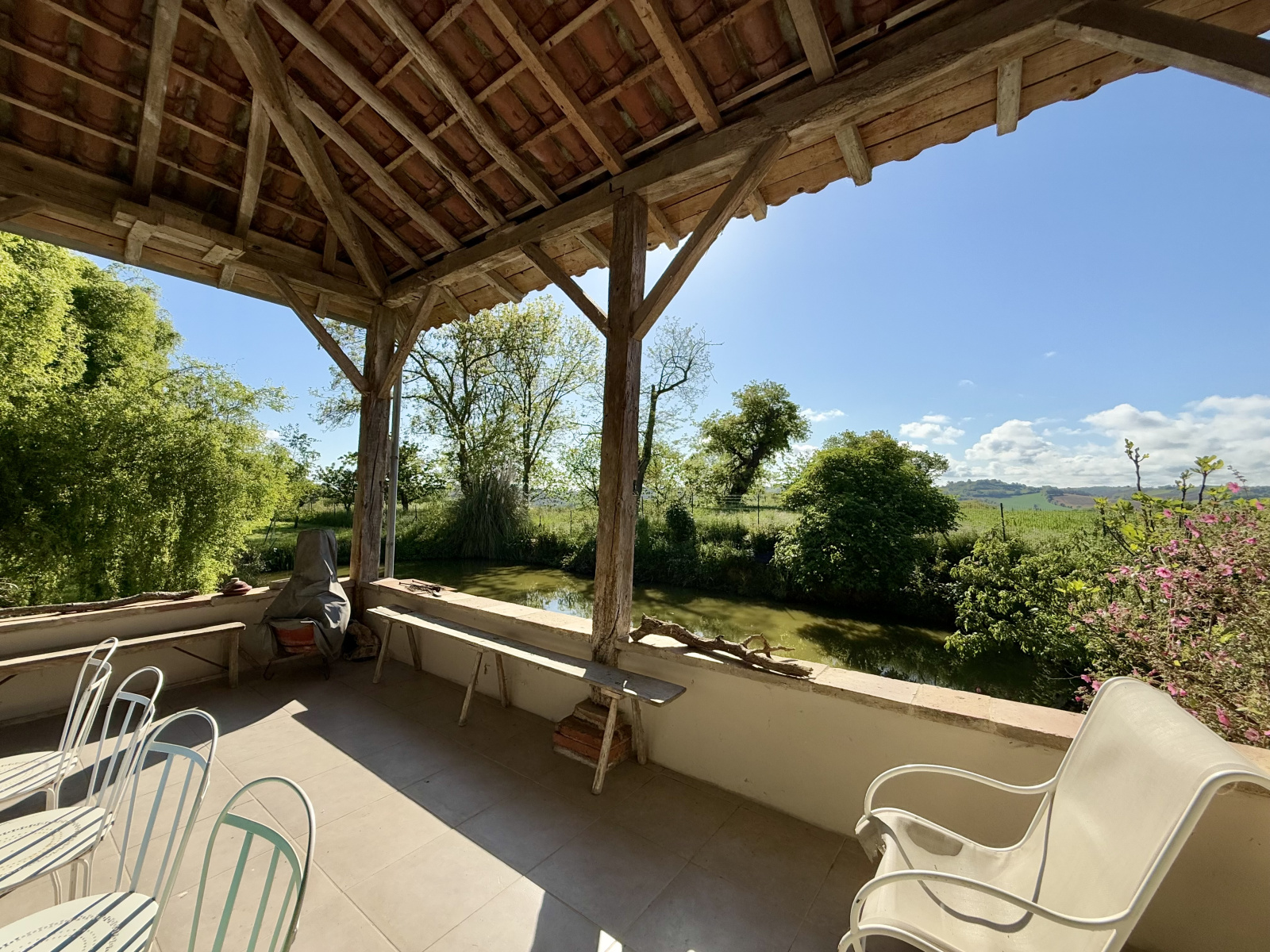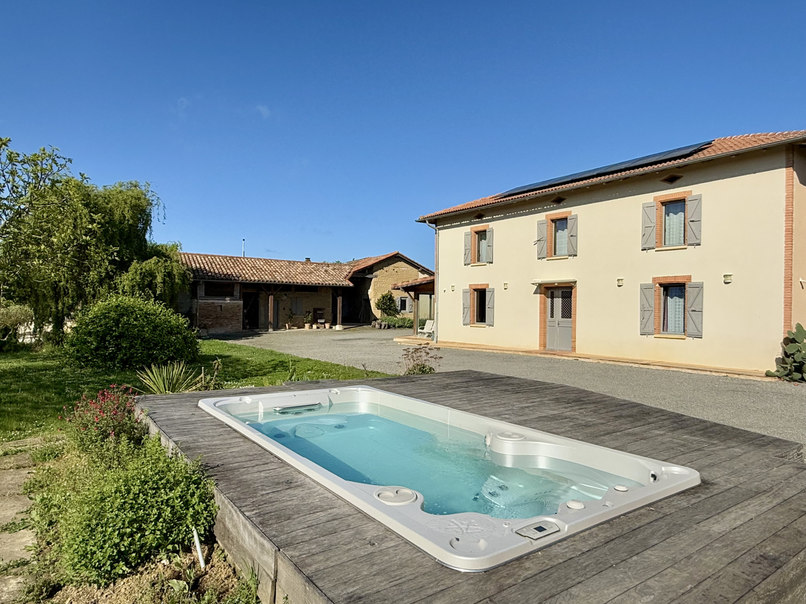 A l'extérieur, le terrain d'un hectare constitue un véritable havre de paix. Vous pourrez profiter d'une terrasse couverte équipée d'une cuisine d'été, offrant une vue dégagée sur la chaîne des Pyrénées et d'un spa de nage propice à la détente. Une mare, un puit, un terrain de pétanque ainsi, des carrés potagers et de nombreux arbres fruitiers viennent compléter cet environnement privilégié.