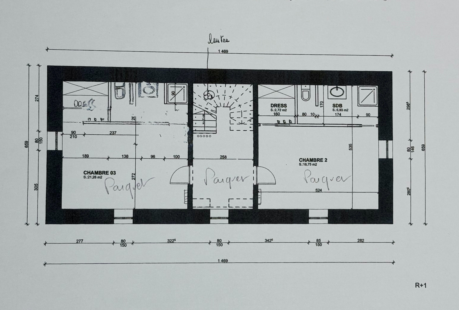 Une chambre de 21.47m2 avec salle d'eau et toilettes de 5.93m2
