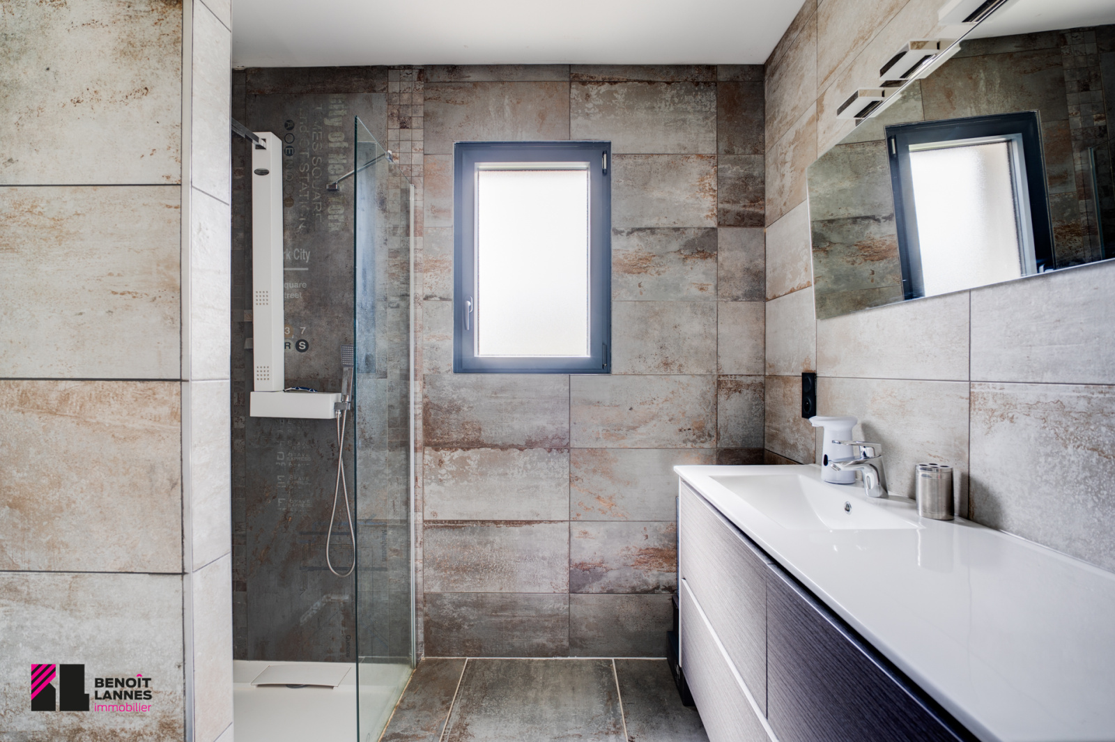 Une salle d’eau de 5 m² avec douche à l’italienne, un meuble vasque et un sèche serviette.