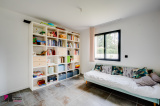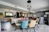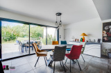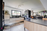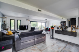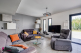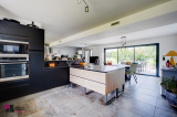 Une piece de vie de 66 m² composée d’un séjour, une cuisine ouverte et un espace bureau très lumineux donnant sur la terrasse et la piscine. Une cuisine équipée de meubles hauts et bas avec four, plaque à induction et hotte aspirante.
